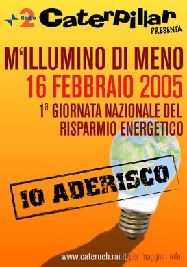 Dopodomani, mercoledì 16 febbraio, Mi illumino di meno, prima giornata nazionale del risparmio energetico, organizzata dalla trasmissione Caterpillar, di Radio2. Spegnamo le luci inutili, usiamo lavaggi economici, ecc.